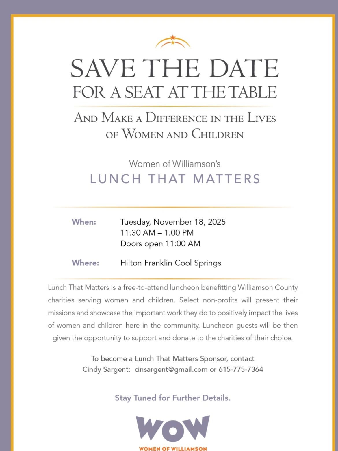 Women of Williamson will be hosting it's annual Lunch That Matters to raise funds for Williamson County non-profits who support women and children. Plan to join us at the Hilton in Cool Springs on November 18th.